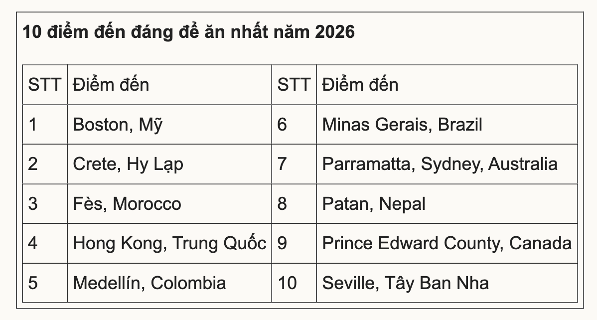 Danh sách “Những nơi đáng đến để ăn nhất năm 2026” do tạp chí Mỹ Condé Nast Traveller công bố ngày 18/12 ra đời dành riêng cho cộng đồng du khách lấy ăn uống làm trung tâm hành trình. Tiêu chí bình chọn tập trung vào danh tiếng và sức hút ẩm thực – những nơi đủ hấp dẫn để khiến du khách lên kế hoạch du lịch xoay quanh… chiếc dạ dày.